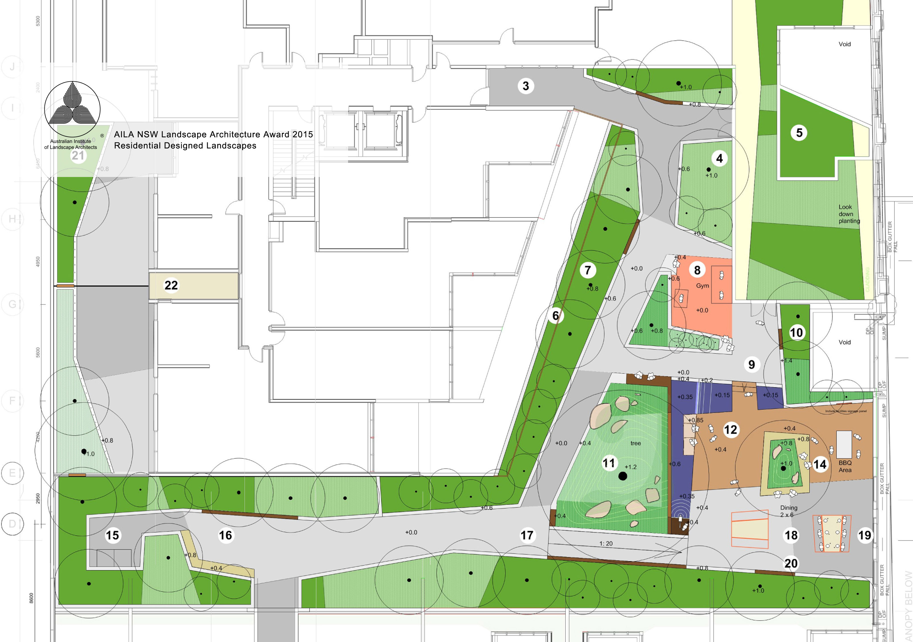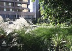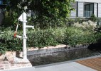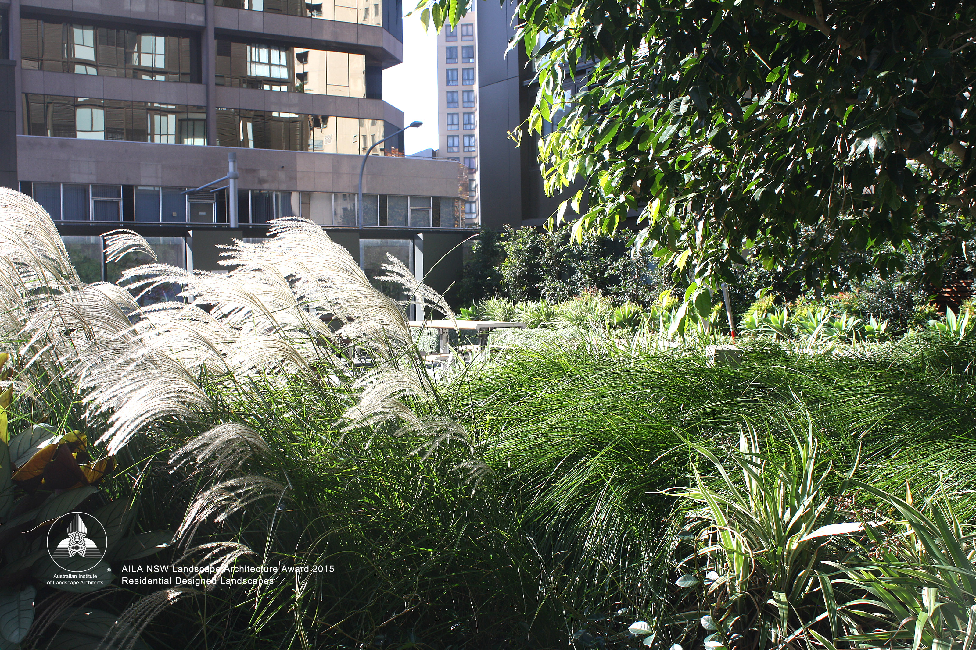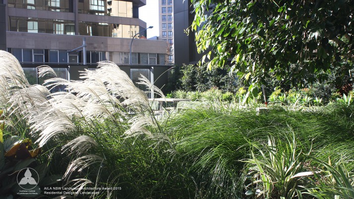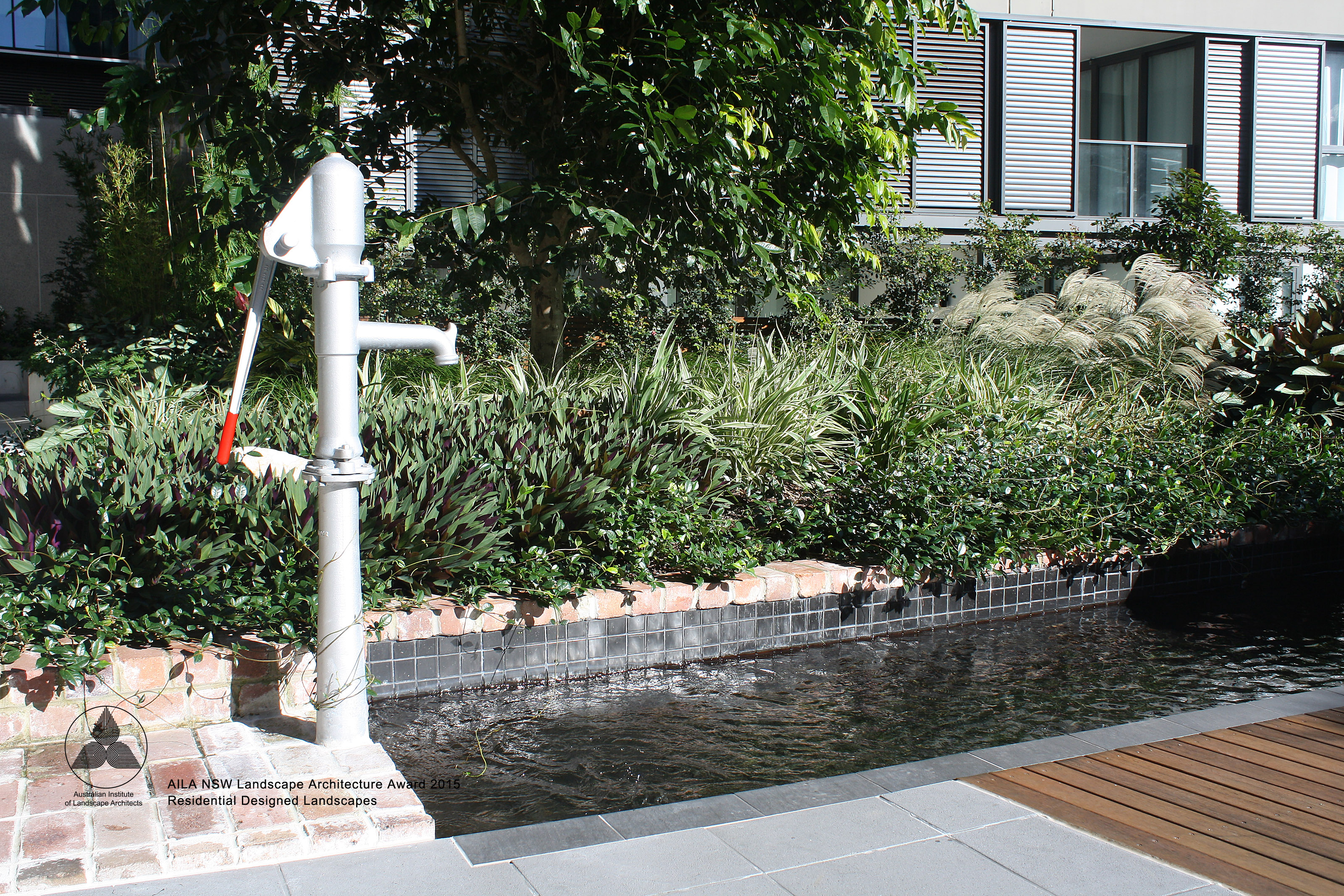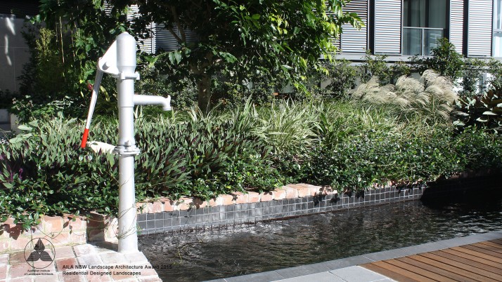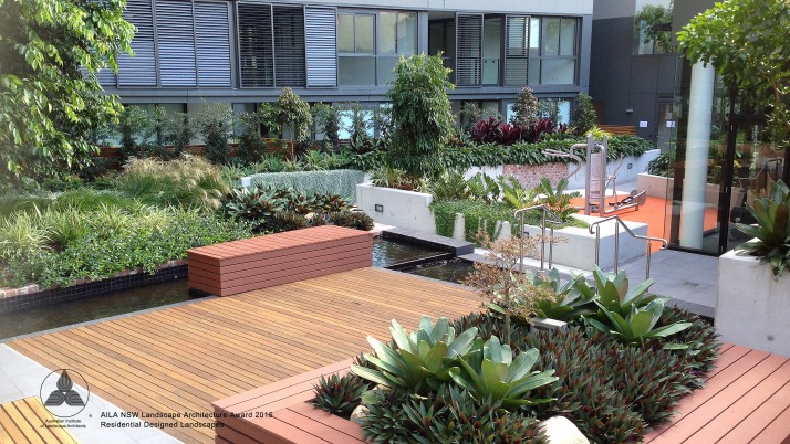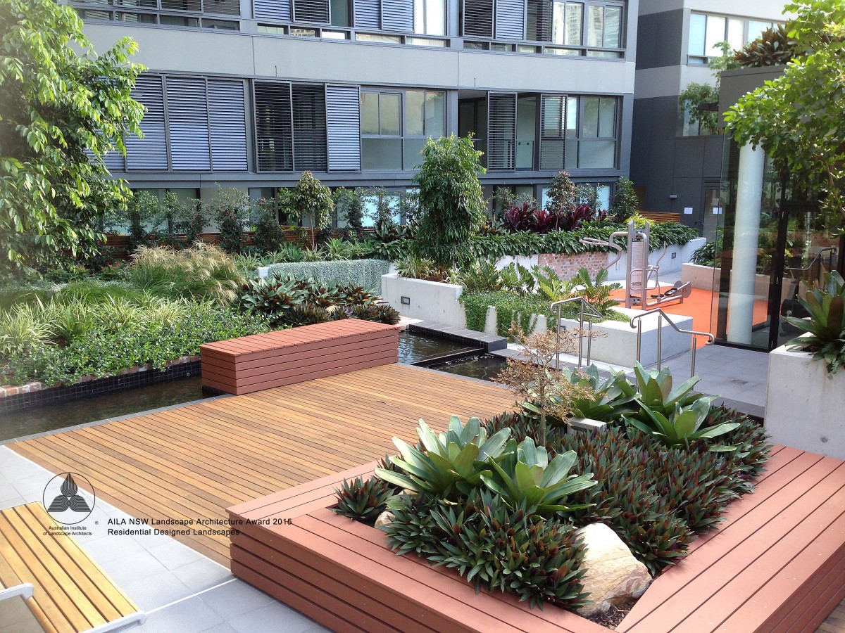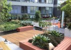 The communal area for Quay apartments Haymarket is an extensive landscaped podium; detailed in timber, concrete and soft grey tones of paving to accentuate heritage brick elements and lush planting. Residents have the opportunity to utilise an outdoor gym, BBQ, dining area and a variety of seating. Seating and paths are set out to engage view lines to lush plantings providing buffer and overhead screening. Seating also adjoins the reflection pool and beautiful seasonally changing Japanese Maple. The communal landscape is fully accessible including the timber deck adjoining the reflection pool.